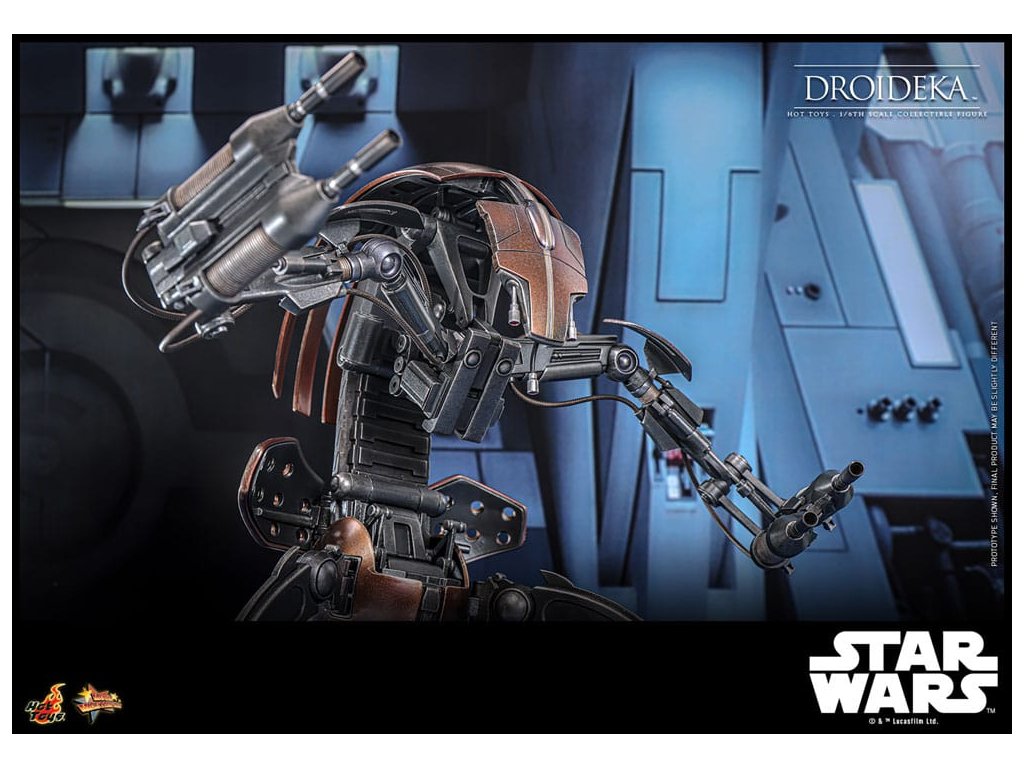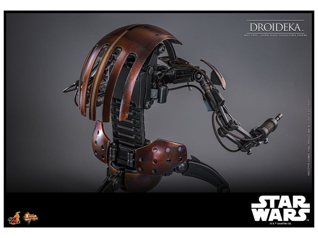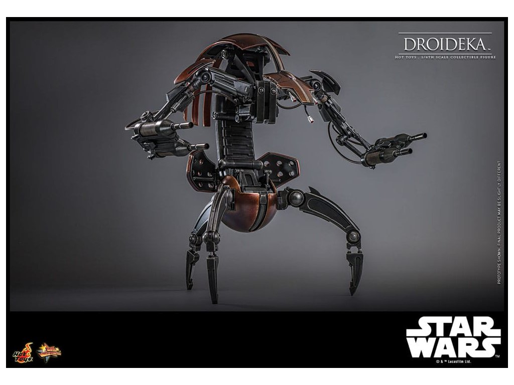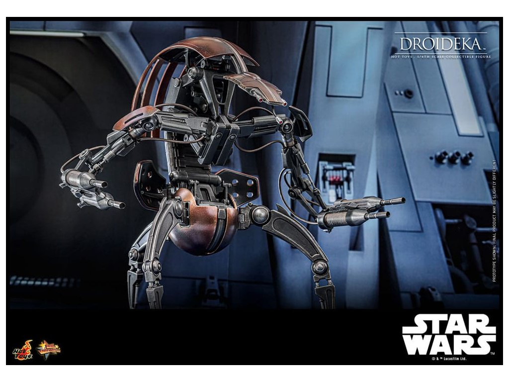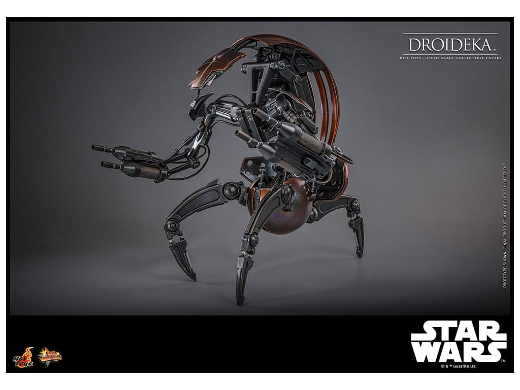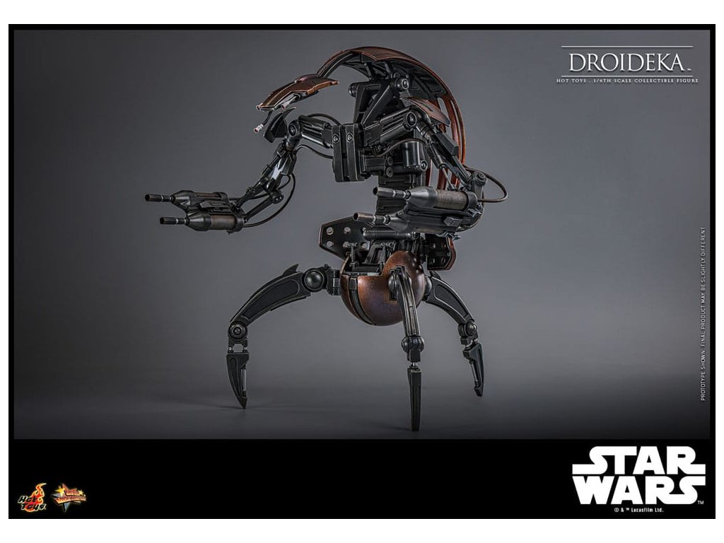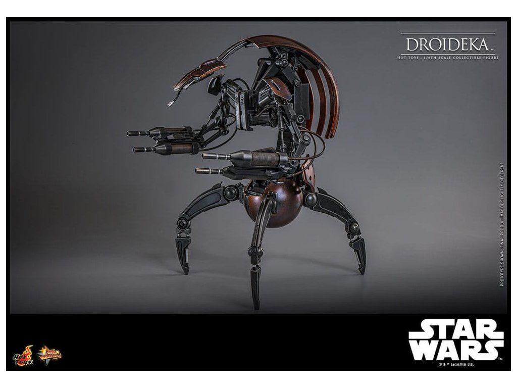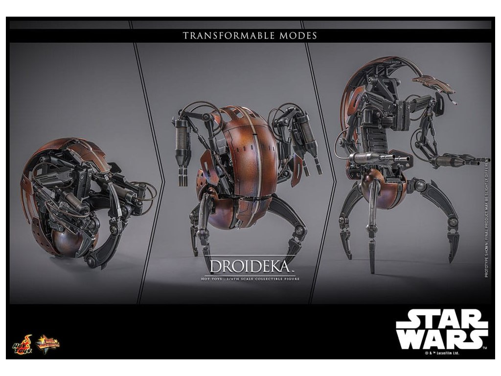 A karcsú harci droidokkal ellentétben, amelyek humanoid teste bizonyos fokú rugalmasságot biztosít számukra, a droidokat egyetlen céllal tervezték: a célpontok teljes megsemmisítése. A nehéz karok végén hatalmas ikerkilövők vannak, amelyek megsemmisítő energiát szabadítanak fel zúzó ritmusban. A bérgyilkos droid kompakt pajzsugráló generátorai segítségével képes teljesen védő energiagömbbe burkolni magát, bár ez a mozgékonysága rovására megy. Bár a droid lassú és esetlen a háromlábú futás közben, képes átalakulni egy sokkal gyorsabb, korongszerű formába. A Star Wars: A Fantomfenyegetés 25. évfordulója alkalmából a Sideshow és a Hot Toys örömmel mutatja be a Droideka gyűjtőfigurák hatodik sorozatát! A Droideka gyűjtőfigurák hatodik sorozata rendkívül részletes mechanikus szerkezetet mutat be, kivételes artikulációval, ügyesen alkalmazott fémfestéssel és a korong alakúvá alakulás képességével! Ez a csodálatos droid egy rendkívüli gyűjtői figura lesz a Star Wars™ gyűjteményedben!Kiegészítő paraméterek