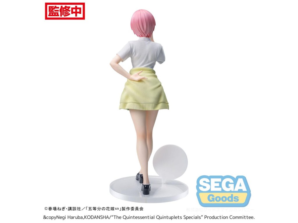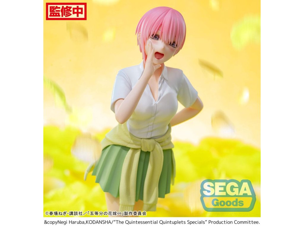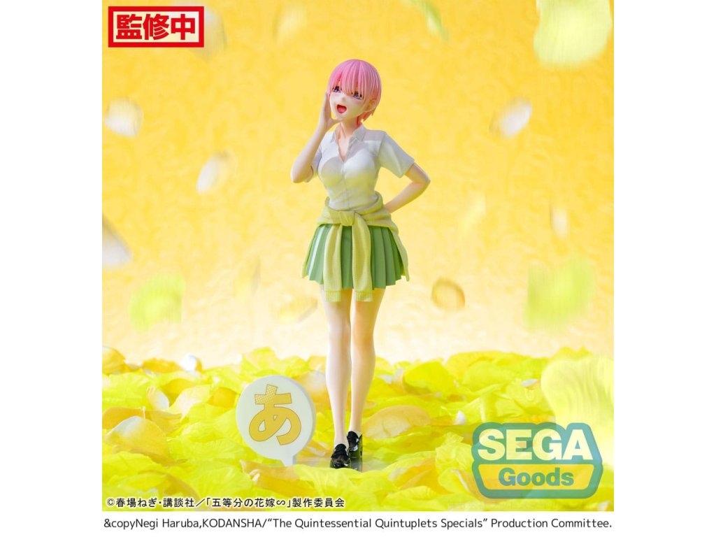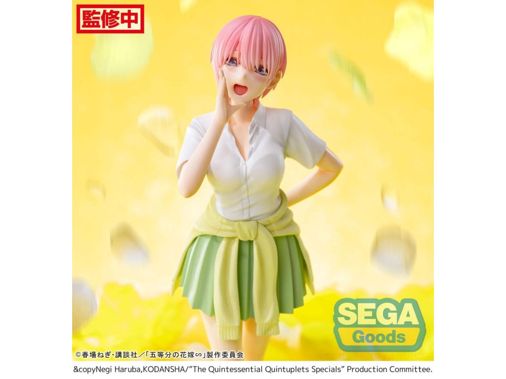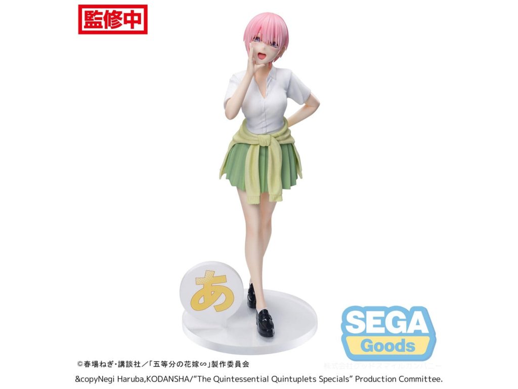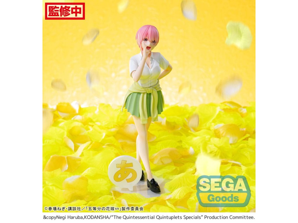 A "Quintessential Quintuplets" sorozatból származik ez a PVC szobor. 20 cm magas, és egy talapzattal együtt, nyomtatott dobozban kerül forgalomba.