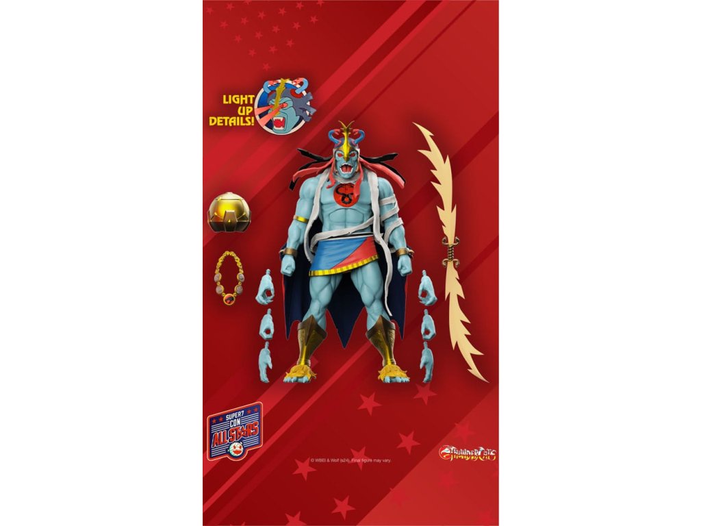 A varázsló és démon-orc, Mumm-Ra™ olyan erős ellenség, hogy puszta látványa még a legelszántabb hőst is megrémíti, aki szembe mer szállni vele! Ez a 7 hüvelykes (kb. 18 cm), rendkívül jól tagolt ThunderCats ULTIMATES! Mumm-Ra™-t a klasszikus animációs TV-sorozat ihlette, és elemmel működő, LED-es világító szemekkel, részletes szobrászattal és prémium minőségű festéssel rendelkezik. A csomagban több cserélhető kéz, valamint számos kiegészítő is található, köztük egy mozgatható, puha anyagból készült köpeny, az Aranygömb Seti, a Hűséglánc és a sötétben világító Plun-Darr kard. Ez a félelmetes, egyedi készítésű, LED-világítású szemekkel ellátott Mumm-Ra™ figura annyira félelmetes, hogy a ThunderCats-gyűjteményed többi figurája is reszketni fog a félelemtől. Tartozékok: - 8x cserélhető kéz - 2x ököl - 2x váltakozó nyitott kéz - 2x váltakozó kéz a fogáshoz - 2x váltakozó lapos kéz a fogáshoz - 1x Plun-Darr kard (sötétben világít) - 1x Seti aranygömb - 1x Hűséglánc - 1x Puha anyagból készült köpeny (mozgatható) Megjegyzés: a figura 3 darab LR-41/AG3 gombelemet tartalmaz.Kiegészítő paraméterek