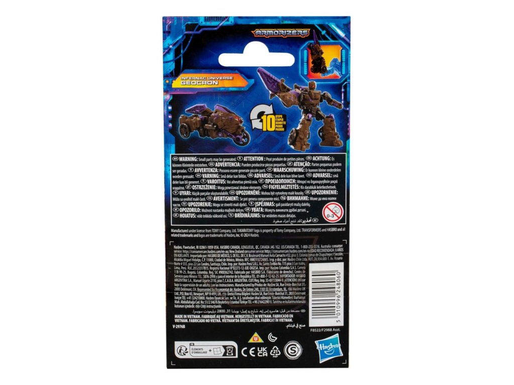 Kombináld gyűjteményedben a kedvenc karaktereidet a Transformers robotvilágából a Transformers Legacy United Core Class Infernac Universe Geocron akciófigurával! Ez a 9 cm-es Infernac Universe Geocron akciófigura egy Armorizer, egy más bolygókon élő kőzetekből és ásványokból létrehozott lény! Kombináld ezt az Armorizer játékot más Transformers figurákkal, hogy menő sziklapáncélokat és fegyvereket alkoss. A figura 10 lépésben átváltozik a sziklalény mód és a motoros mód között is. Készülj fel a csatára a mellékelt sziklapenge kiegészítővel. Ünnepeld a Transformers történetének elmúlt 40 évét a Transformers Legacy akciófigurákkal. A Transformers Legacy egy teljesen új univerzumba nyit kaput - több mint ami látszik - és úgy hozza össze a Transformers minden generációját, ahogy még soha nem láttad. Gyűjtsd és kombináld a különböző figurákat, hogy összeállítsd az ideális Legacy-összeállítást.