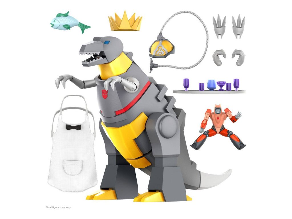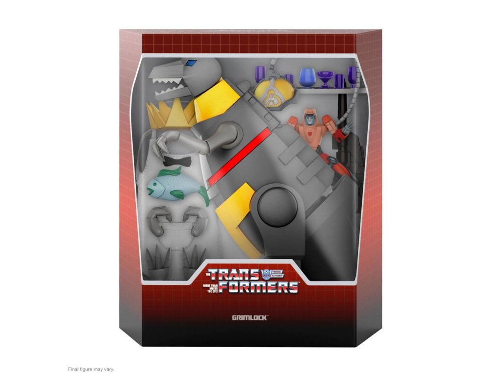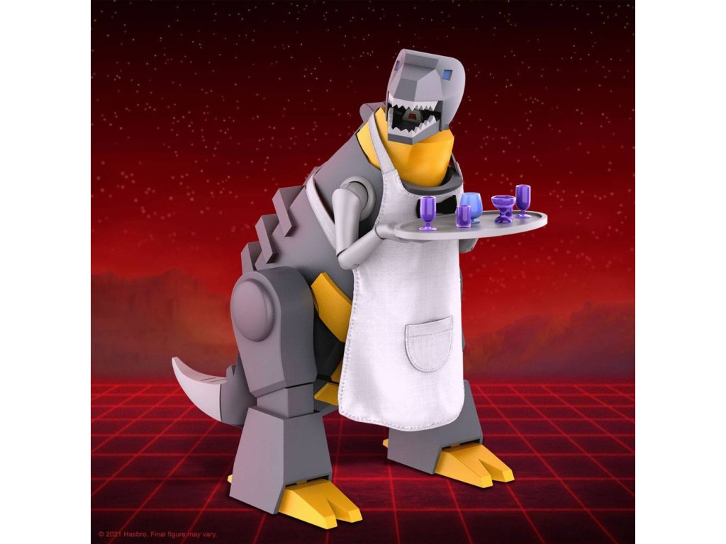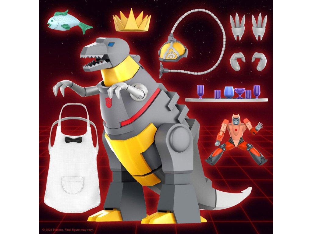 "Én Grimlock!" Az egyik legerősebb és legrettegettebb Autobot, Grimlock képességein túl csak a névmások alapvető használata jelent kihívást, de a nyelvtani hibákat félretéve a Dinobot-vezér a legerősebb Álca ellenfelekkel is képes szembeszállni a csatatéren. Ez a 23 cm magas, részletesen kidolgozott Transformers ULTIMATES! Grimlock Dino módban pontosan úgy van festve, mint a G1-ben, és rengeteg kiegészítővel rendelkezik, amelyek között szerepel a pincérként töltött idő is. Még egy megjegyzést a végére tartogattunk, megkapod Wheelie-t, az Autobotot, a barátját is! Ő Grimlock hátán lovagolhat, támadásra készen! Grimlock erőssége az akció, nem a diplomácia, így az ő szellemében egyszerűen csak egészítsd ki Transformers gyűjteményedet ezzel a hatalmas harcossal! Tartozékok :- 6x cserélhető kéz- Sisak a gondolatátvitelhez- Puha pincérkötény- Tálca- 6x ital- Hal- Királyi korona- Kerekes.Kiegészítő paraméterek