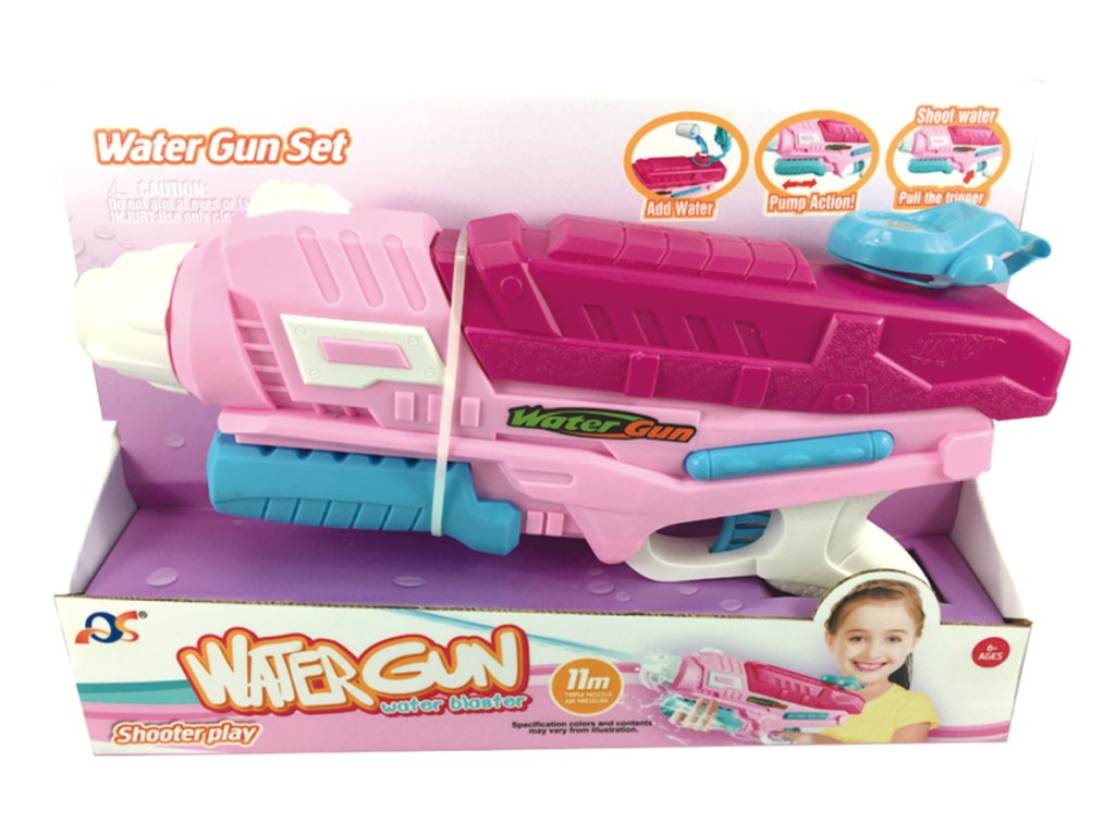 Rózsaszín vízipisztoly víztartállyal. Méret 35 cm. Hatótávolság akár 11 m.
