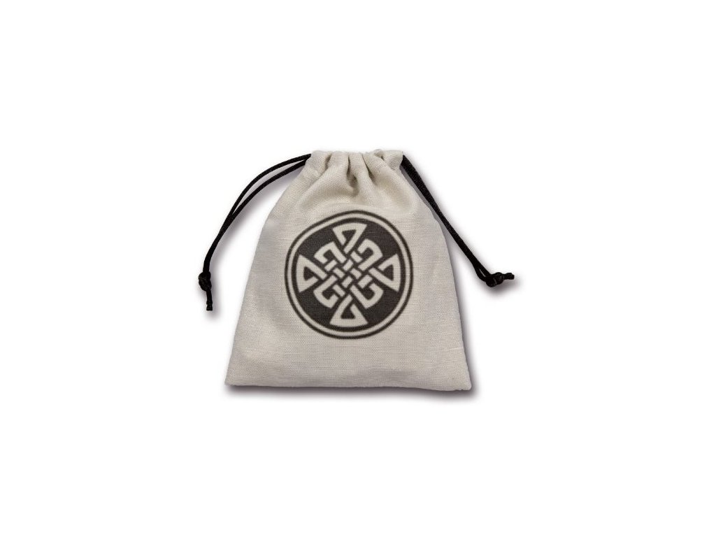 Vászon zsinóros táska kockák számára, mindkét oldalán kelta fonással díszítve. A táska mérete 10 x 13 cm.