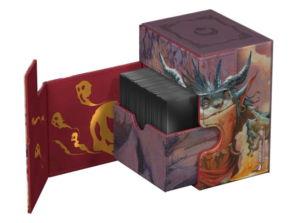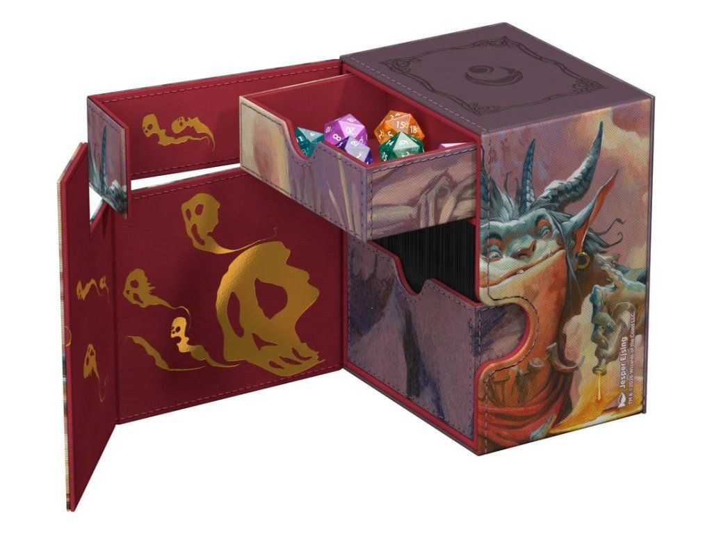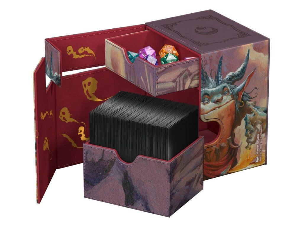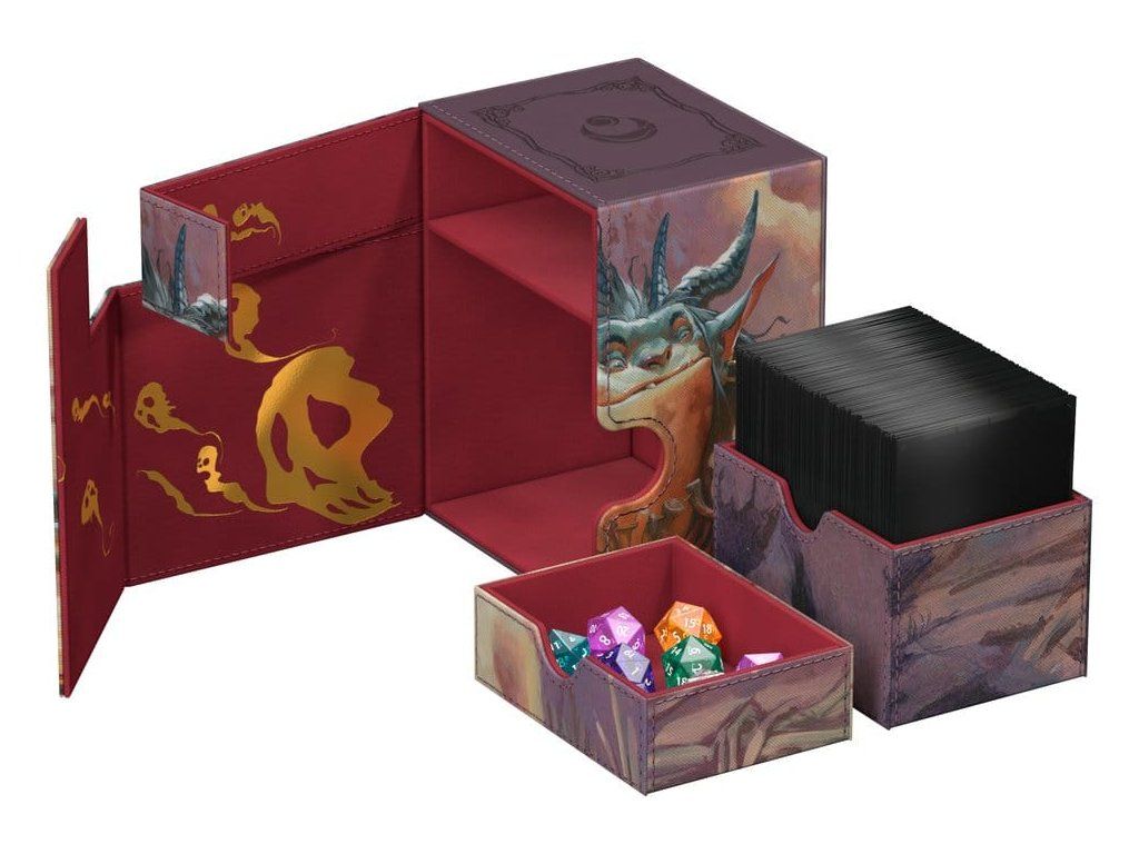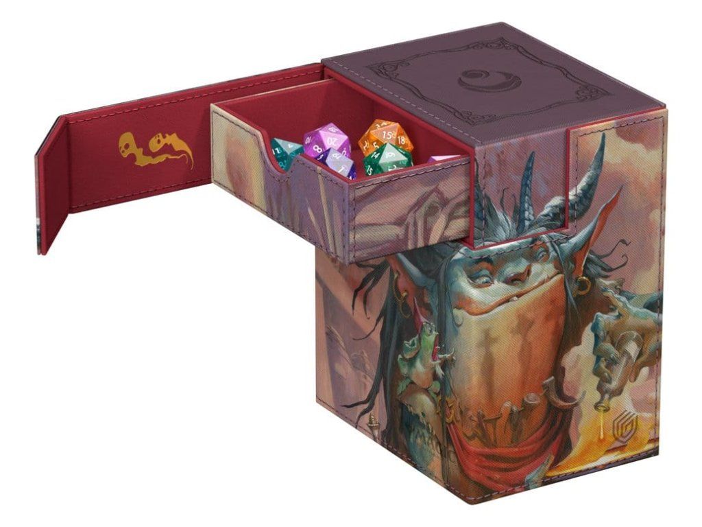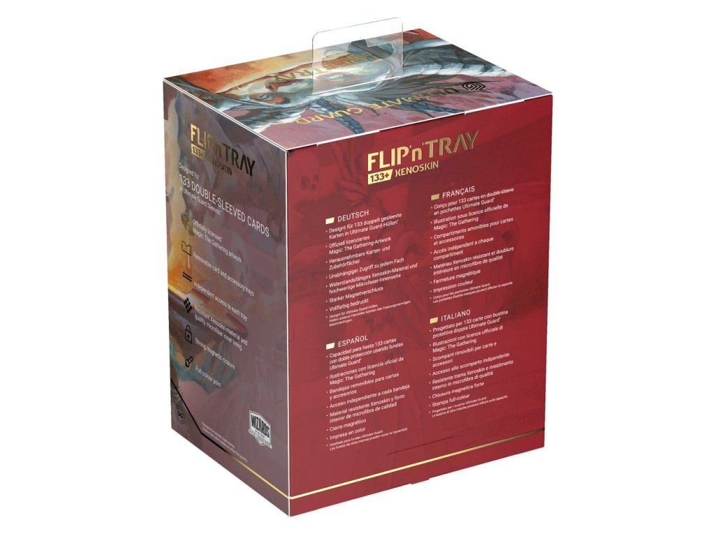Az Ultimate Guard Flip'n'Tray 100+ Xenoskin az MTG prémium kártyásdoboza minden Magic formátumhoz (Commander/EDH, Modern, Standard, stb.), két külön hozzáférhető tálcával - az egyikben 100 dupla csomagolású, Ultimate Guard fóliába* csomagolt kártya, a másikban pedig kockák és kiegészítők találhatók. A Magic: The Gathering "Lorwyn Eclipsed" szettjének hivatalosan licencelt grafikájával ellátott Flip'n'Tray 100+ tartós Xenoskin anyagot, mikroszálas belső bélést és erős mágneses záródást kínál a kártyák kivételes védelme érdekében. Úgy tervezték, hogy más Ultimate Guard termékekkel kombinálható legyen, így ez a kártyadoboz képes befogadni a Boulder 100+-t, ha a kártyatálcát eltávolítják.