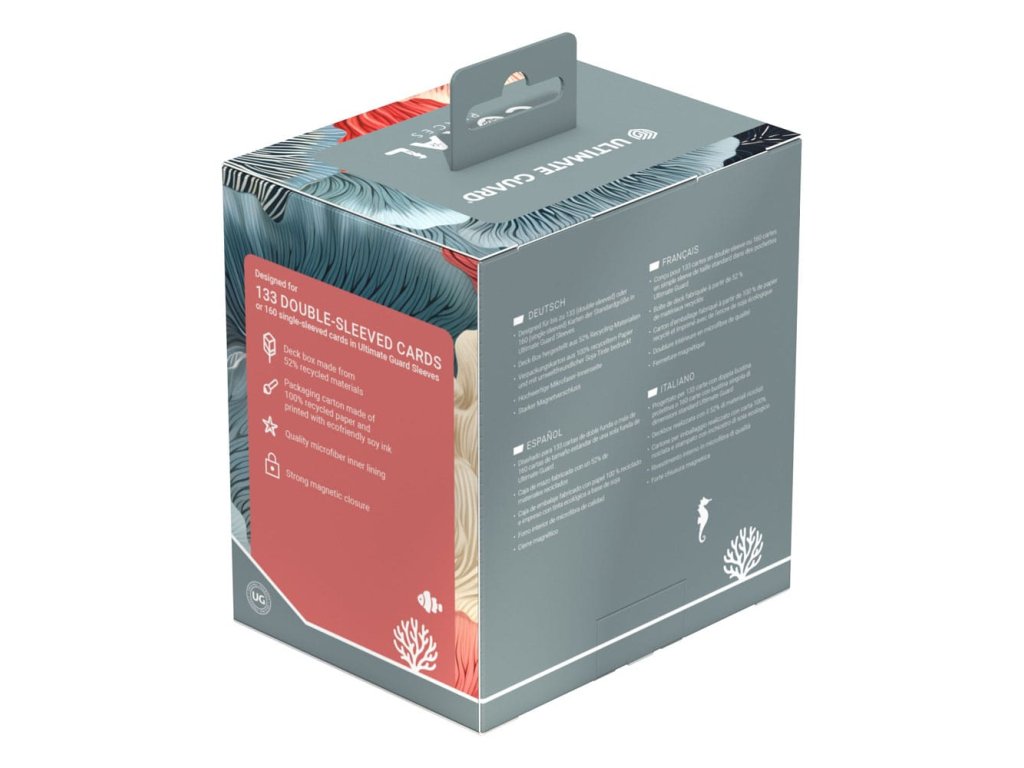 Merülj el a virágzó víz alatti világokban a Coral Places Sidewinders by Ultimate Guard játékkal! A fenntartható kártyadobozok 52%-ban újrahasznosított anyagokból készülnek, és a tartós Xenoskin felület mellett erős mágneses záródással és kiváló minőségű mikroszálas belső béléssel rendelkeznek. A 133 dupla csomagolású kártya* befogadóképességével ez a tökéletes MTG kártyadoboz a Commander paklid számára, extra hely a tokeneknek! A műanyagmentes csomagolás ráadásul teljes egészében újrahasznosított papírból és cellulóz alapú fóliából készült.
