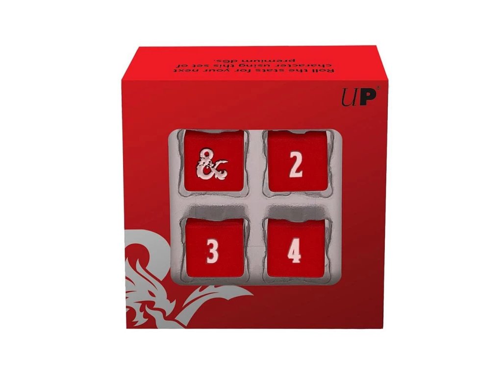 A készlet 4 piros fém hatszögletes kockát tartalmaz az Ultra Pro Dungeons & Dragons szerepjátékhoz. A kockák cinkötvözetből készültek, és csattogásukkal minden ellenséget rettegésben tartanak! A kockák fehér színűek, a 6-os szám helyén az ikonikus Dungeons & Dragons logóval.Kiegészítő paraméterek