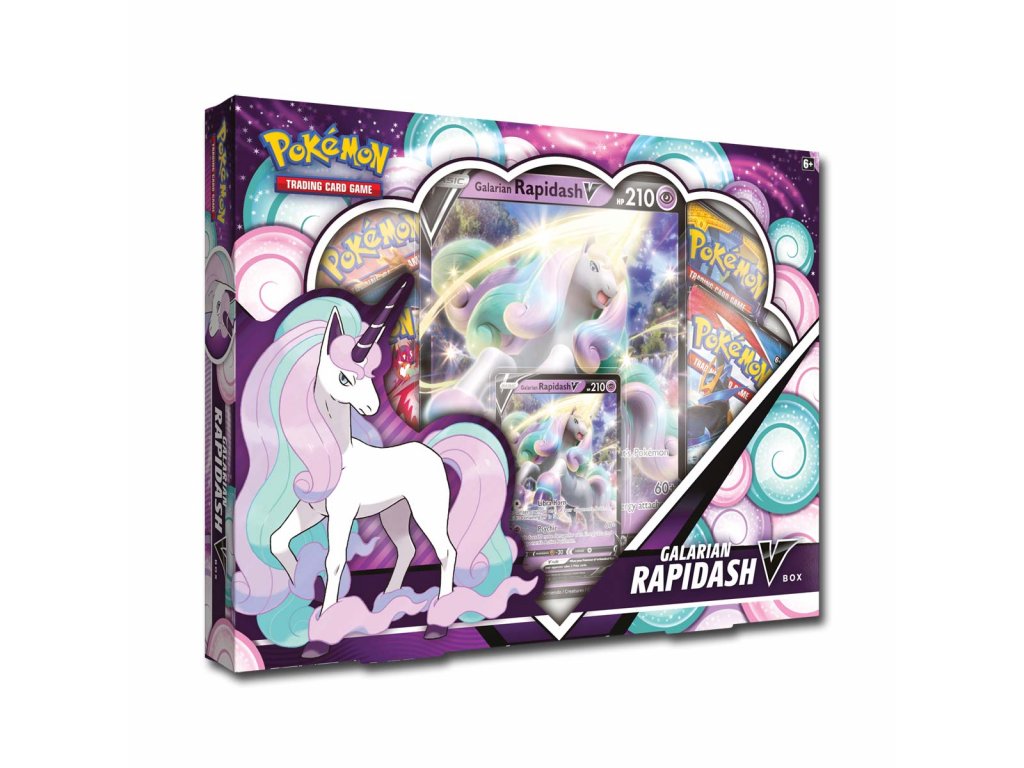 A Galarian Rapidash V pusztító pszichés támadásairól ismert, amelyeket hosszú, csavart szarvakkal hajt végre - most már te irányíthatod támadásait! Ebben a boxban találja a "Pokémon V" verziót két változatban - fólia promóció és oversized kártya. Természetesen négy Booster csomag is létezik, amelyek jelentősen kibővítik az egyes játékosok gyűjteményét.