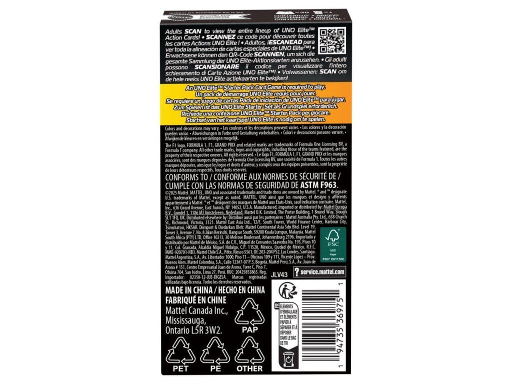 Az UNO Elite Formula 1 2025 Core Edition bővítmény kártyáinak hozzáadása az UNO Elite Formula 1 kártyajátékhoz még gyorsabbá teszi a versenyt. Minden készlet 3 bővítményt tartalmaz, amelyek mindegyike 10 különleges Elite kártyát tartalmaz, összesen 30 kártyát. Melyik kártya kerül kiosztásra? Minden különleges Elite-kártyának saját különleges képessége van, amely akkor lép működésbe, amikor a játékos kijátszik egy Elite-szimbólummal ellátott kártyát. És persze a játékosoknak nem szabad elfelejteniük, hogy "UNO!" kiáltsanak, amikor már csak egy kártya marad a kezükben! Ez a verseny témájú játék remek ajándék minden 7 éves és idősebb Forma-1 és kártyajáték rajongónak. A színek és a témák változhatnak.Kiegészítő paraméterek