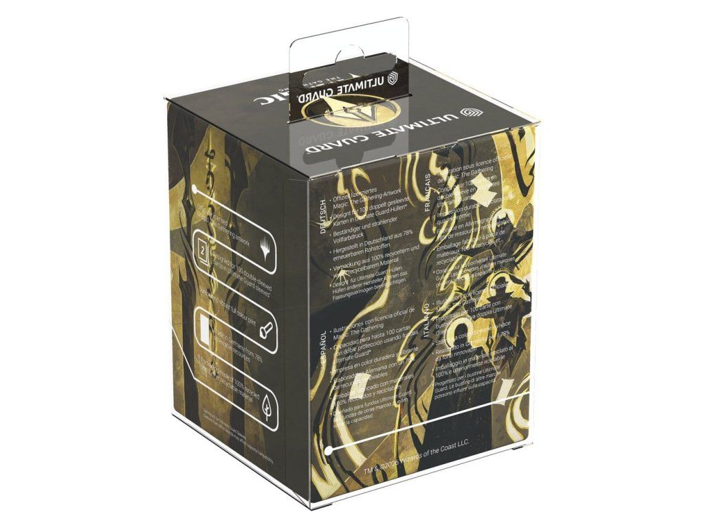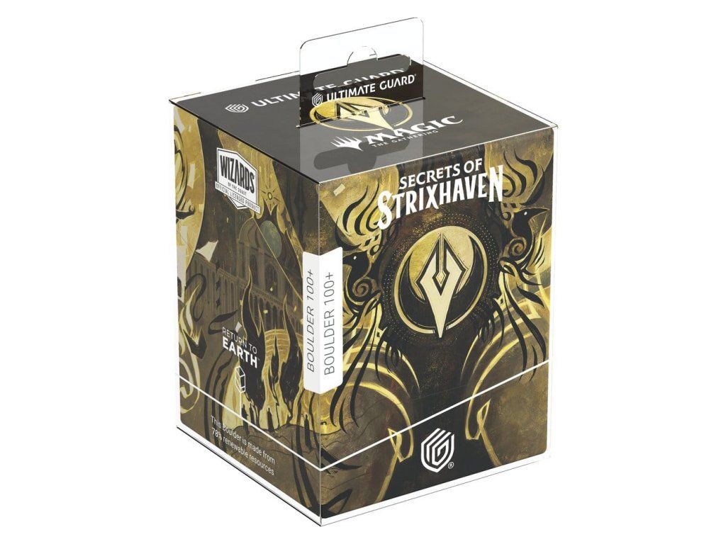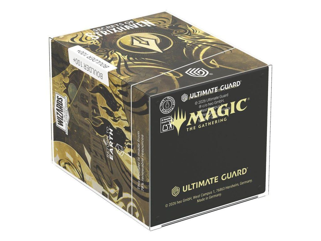 Az Ultimate Guard RTE Boulder 100+ egy tartós és megbízható Magic: The Gathering kártyadoboz, amely 78%-ban megújuló nyersanyagokból készült Németországban. Bár szilárd záródással rendelkezik, az RTE Boulder 100+ könnyen és kényelmesen nyitható, és 100 darab, dupla burkolatú Ultimate Guard* kártyát tartalmaz, így ideális doboz minden Magic formátumhoz (Commander/EDH, Modern, Standard stb.). Az MTG kártyadoboz élénk, színes nyomtatással, a Magic: The Gathering "Secrets of Strixhaven" szett hivatalosan licencelt grafikájával, valamint 100%-ban újrahasznosított és további újrahasznosítható anyagokból készült környezetbarát csomagolásban kerül forgalomba. Az összes Ultimate Guard ömlesztett tárolódobozhoz tervezték, a Boulder különösen jól illeszkedik az Arkhive, Superhive és Flip'n'Tray dobozokhoz.