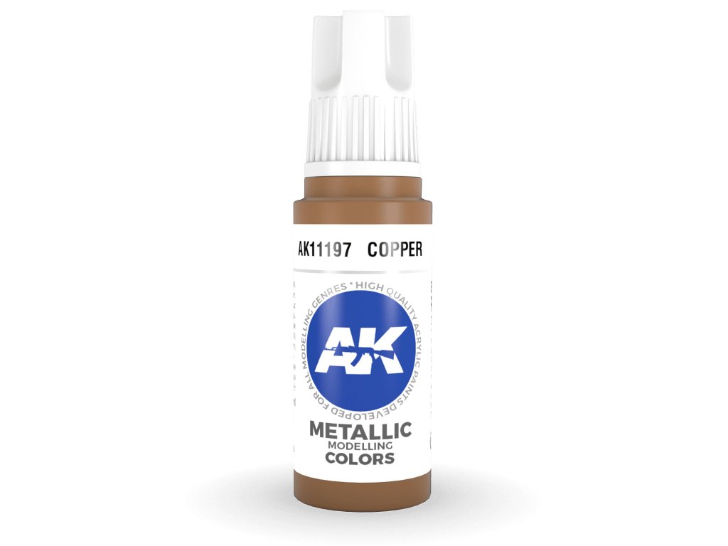 A Metallic Copper akrilfesték az AK Interactive-tól ecsettel és ecsettel történő felvitelre alkalmas. A 3. generációs akril modellfestékek (3Gen) az eddigi legkifinomultabb akrilfesték-formuláció. A General Series festékek kiváló fedőképességgel, elképesztő tapadással rendelkeznek, és az új összetétel megakadályozza a fúvóka eltömődését anélkül, hogy hosszadalmas festékkeverésre lenne szükség.Kiegészítő paraméterek