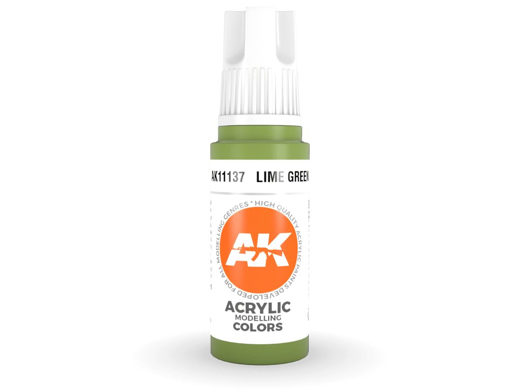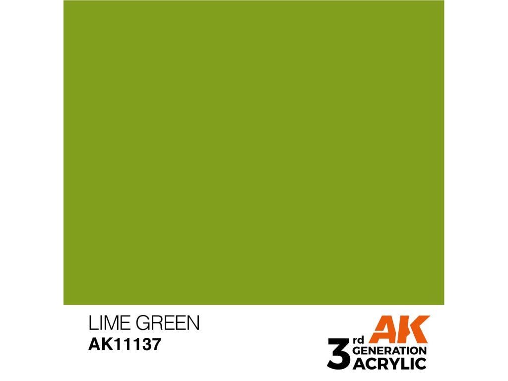 A Lime Green akrilfesték az AK Interactive-tól ecsettel és airbrush-rel történő felvitelre alkalmas. A 3. generációs akril modellfestékek (3Gen) az eddigi legkifinomultabb akrilfesték-formuláció. A General Series festékek kiváló fedőképességgel, elképesztő tapadással rendelkeznek, és az új összetétel megakadályozza a fúvóka eltömődését anélkül, hogy hosszadalmas festékkeverésre lenne szükség.Kiegészítő paraméterek