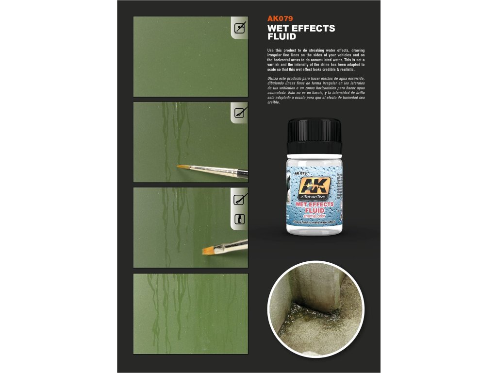 A Wet Effects Fluid az AK Interactive zománcos terméke, amelyet valósághű eső-, tócsa- vagy vízhatások elérésére használnak. Ez nem fényes lakk, ezt a terméket kifejezetten olyan használatra tervezték, amely a felülettől függően különböző fényerősséget kínál.Kiegészítő paraméterek